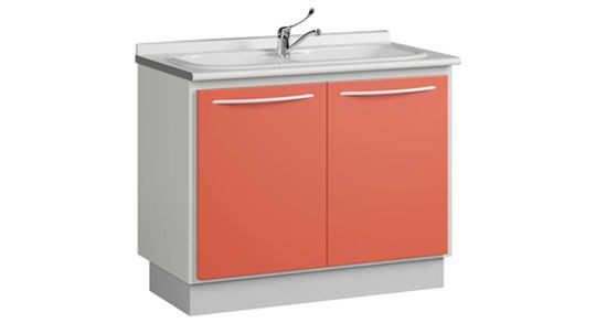 Комплект мебели включает в себя: Модуль с двойной акриловой мойкой слева(П-10 2М ), модуль с дверцей и полкой(П-10) и бактерицидный модуль(П-12Б).